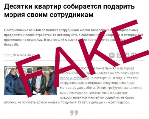 Новый фейк о возможности получения сотрудниками хабаровской мэрии служебных квартир «в подарок» распространяют местные электронные ресурсы. В сообщении говорится, что после 15 лет «отработки» чиновники будто бы могут получить в собственность жилье, которое они занимают по найму и, якобы, сейчас насчитывается более 50 таких кандидатов в собственники.