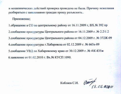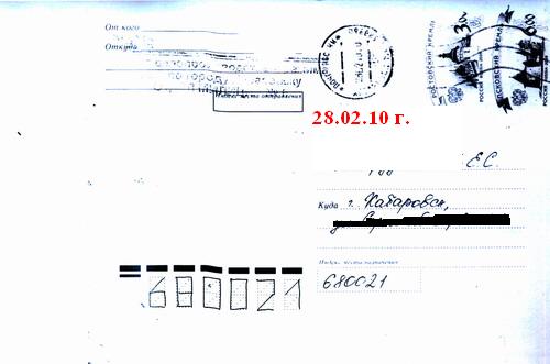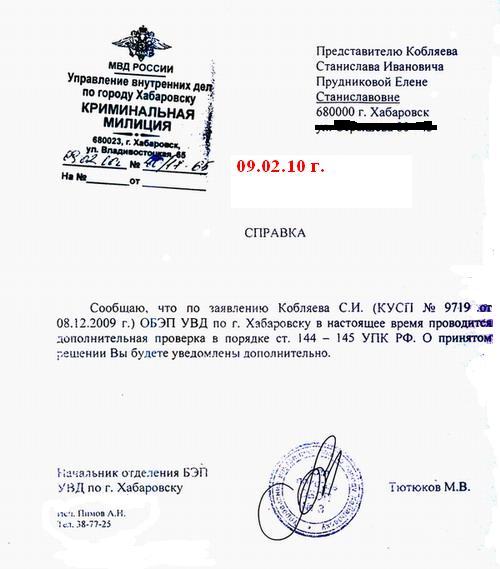И вот 6 марта 2010 года (дата по штемпелю) заявителям пришел еще один ответ. Уже старший оперуполномоченный ОБЭП УВД Хабаровска А.Н. Пимов пишет: «в рамках проверки, установить местонахождении и опросить гр. Клоцбихера А. В. не представилось возможным», а значит и «установить факт совершения мошеннических действий». И дата: 8 декабря (!) 2009 года.