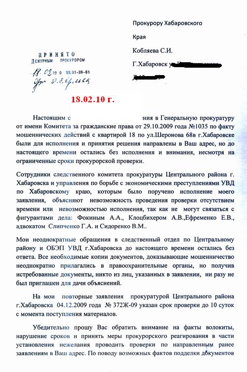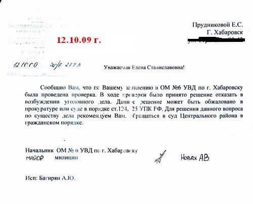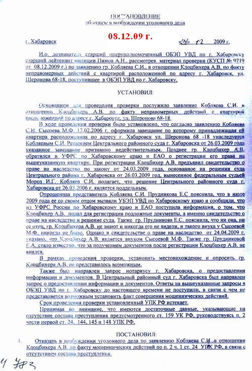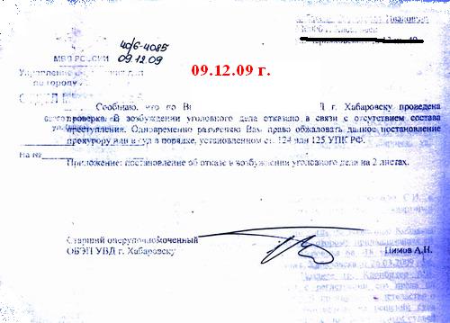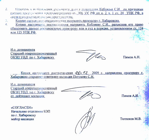 Первый зампрокурора Центрального района Хабаровска В. В. Демидовский констатирует: 8 декабря и.о. дознавателя старшим оперуполномоченным ОБЭП УВД по Хабаровску А.Н. Пимовым было отказано заявителю в возбуждении уголовного дела по факту мошеннических действий в отношении Клоцбихера. Прокуратура проверила факты, постановление признало незаконным и отменило его.