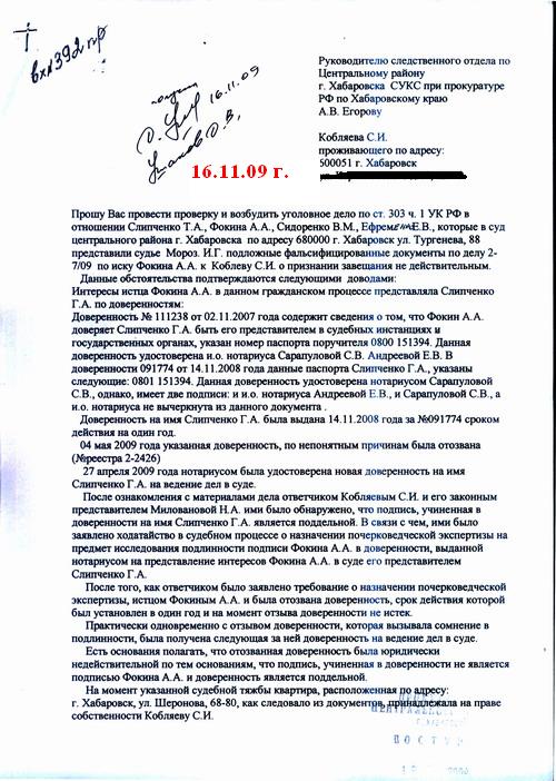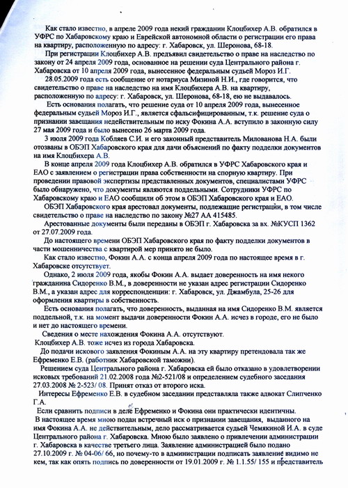 Судебная тяжба еще не завершена, на квартиру наложен арест. Хотя в управление Федеральной регистрационной службы по Хабаровскому краю и ЕАО уже приходили «владельцы» этой квартиры. С поддельным свидетельством № 27 АА 415485 «О праве на наследство по закону» за подписью нотариуса Н.И.Мизиной и с поддельным судебным решением Центрального районного суда Хабаровска заявился, цитирую: «внук М.Ф.Сысоевой - Клоцбихер Александр Васильевич». Правда, в ФРС сразу разобрались — нотариус ответила чиновникам, что никакого свидетельства не удостоверяла. По словам ответчиков, никакого внука у бабы Маши быть не может, в решении суда перепутаны даты его вынесения, а значит, оно тоже поддельное.