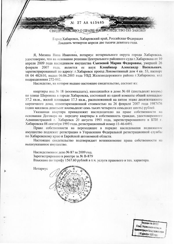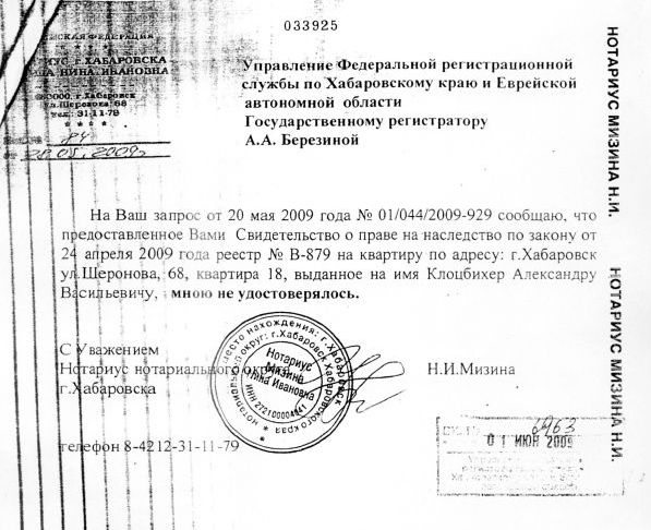 Ранее нам был уже известен один факт попытки мошенничества. О нем мы писали в статье «Два завещания бабы Маши» (см. «ХабЭкс» № 49 от 02.12.09). Напомним, в прошлом году в управление Федеральной регистрационной службы по Хабаровскому краю и ЕАО неожиданно пришел «владелец» арестованной по суду квартиры № 18 по ул. Шеронова, 68 с полным набором нотариально заверенных документов. Некий Клоцбихер предъявил свидетельство «О праве на наследство по закону» и заявил, что он наследник квартиры (внук!), и попросил оформить квартиру в его частную собственность.