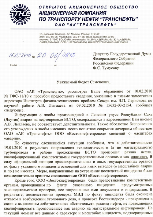 Похоже, что неугомонный Федот Тумусов, в ранге депутата Государственной Думы Российской Федерации действительно развил активную и результативную деятельность, если даже такие государственные монстры как ОАО «Транснефть» встают на тропу войны с ним как равный с равным. Ничем иным нельзя объяснить появившейся на российском сайте compromat.ru статью «Сколько зарабатывает на экологии миллионер-депутат Тумусов» Андрея Воронова.