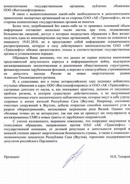 Об этом красноречиво говорится в интервью Платона Терентьевича «…Ведь, в принципе, ВСТО — это большое благо для жителей республики. Мегапроекты могут принести пользу, а могут привести к большой трагедии. Поэтому властям необходимо сделать тройную страховку. Труба ведь идет под рекой Леной.