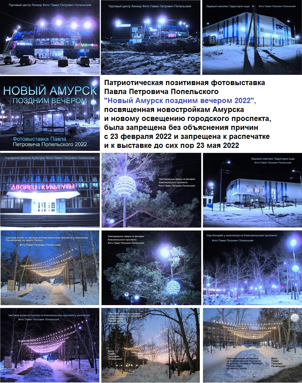 Но когда я подготовил специально для города в феврале 2022 новую эффектную выставку о новостройках Амурска, о новых построенных в городе за 2021-2022 зданиях и о новом освещении Комсомольского проспекта, именно эту позитивную и жизнерадостную фотовыставку почему-то запретили.
