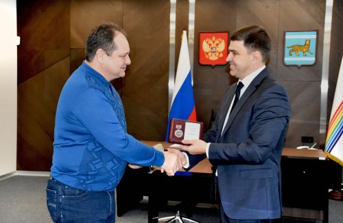По поручению коллектива начальник Дальневосточной железной дороги Евгений Вейде вручил губернатору ЕАО Ростиславу Гольдштейну юбилейную памятную медаль «125 лет Дальневосточной железной дороге».