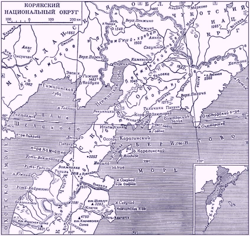 - Президиум ВЦИК постановляет: 1. Образовать на территории расселения малых народностей Севера нижеследующие национальные административные объединения: Корякский национальный округ (окружной центр Пенжинская культбаза) и районы - Карагинский (центр Карага), Олюторский (центр Тиличики), Пенжинский (центр Каменское) и Тигильский (центр Тигиль). (Летопись.с.87)
