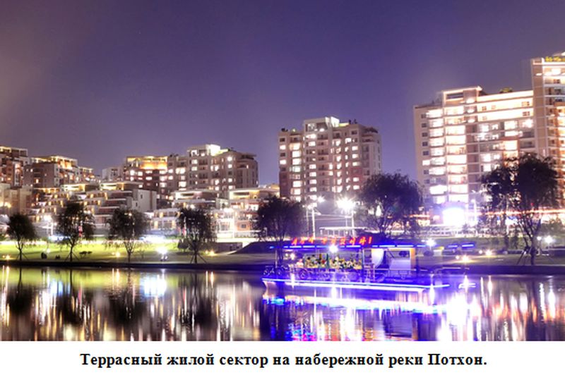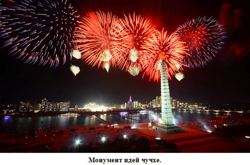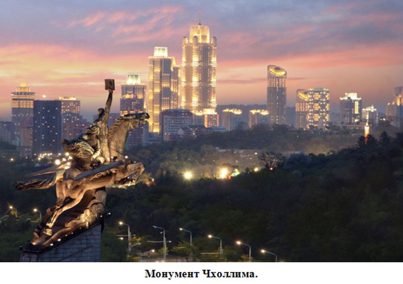 Самая высокая в мире каменная пагода – Монумент идей чучхе (170м), монумент Чхоллима, оригинальные световые декорации на улицах, яркие огоньки у окон жилых домов в полной гармонии умножают красоту ночного пейзажа Пхеньяна.