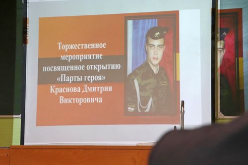Церемония открытия «Парты Героя» прошла в кабинете химии, где учился юноша. Вспомнить и почтить память героя собрались родные и друзья Дмитрия, учителя молодого человека и учащиеся школы, представители органов власти.