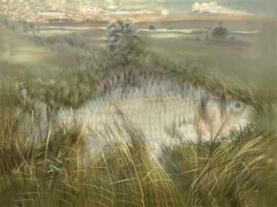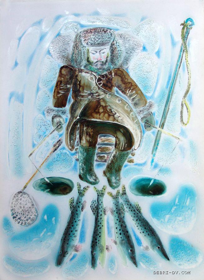 В картине «Весна» все узнают хабаровский утес, я представил эту гору с двумя бойцовскими петухами, а внизу Амур с островками льдин и перья - перистые облака. А в «Лете» - карась размером с озеро. Это в селе Новокаменке, что на реке Тунгуске. Там дача Хабаровской краевой организации Союза художников России.