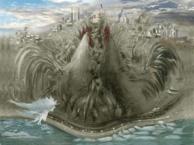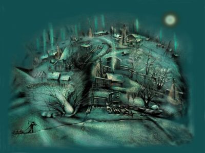 - Да. Зима - картина под названием «Зимняя кошка» - это моя белая Машка, которая жила на даче в Малышево. Вот и получилось два в одном - кошка и деревня. Иллюзорное совмещение. Я сначала фон рисовал дневной, а потом подготовил второй вариант - ночь, все спят, и только дым из труб валит. Мне этот вариант понравился больше. И оставил. Рисунок 2005 года.
