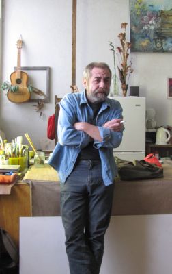 В его мастерской на седьмом этаже в доме на ул. Муравьева-Амурского, 13 на столе большая палитра, где краски намешаны в особом порядке: яркие цвета, теплые и холодные, которые он тут же накладывает на холст.