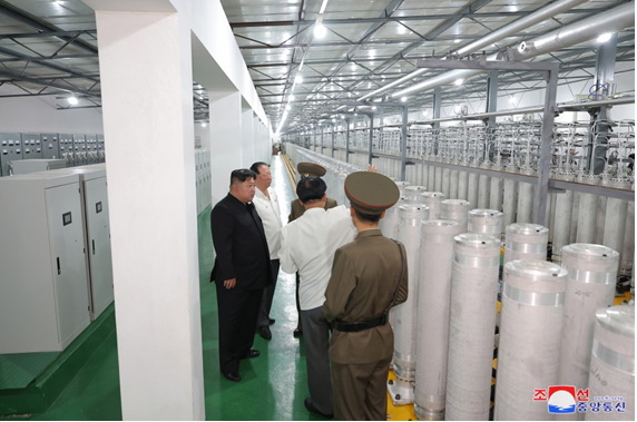 Ким Чен Ын, получив доклад о непрестанном ведении текущего производства ядерных материалов путем исследования, разработки и внедрения собственными силами и техникой всех элементов системы, в том числе центрифуг и разных чувствительных и управляющих устройств, выразил большое удовлетворение.
