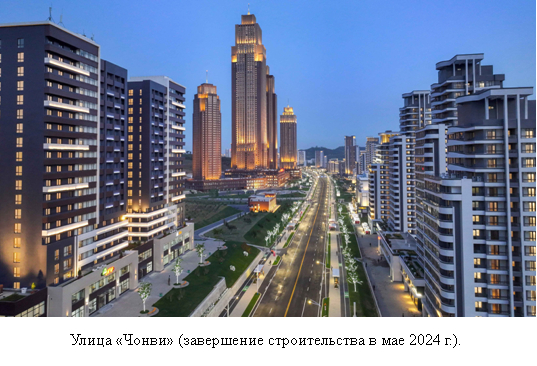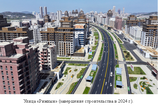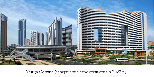 В Пхеньяне – столице Кореи – построены великолепные новые улицы, такие, как улицы Сонхва, Хвасон, «Римхын» и «Чонви», а район Комдока, являющийся базой по производству руд цветных металлов, обновляет свой облик как оригинальный город в горном ущелье.