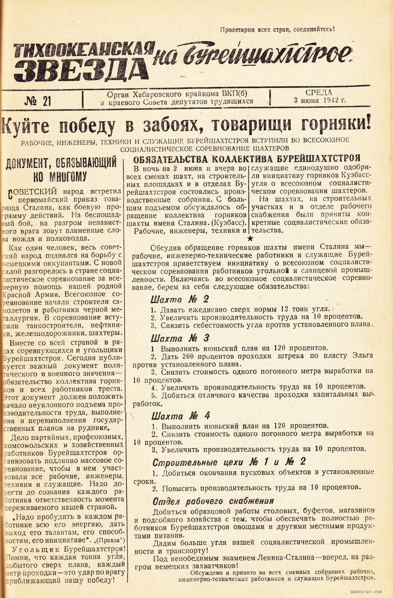 | «Тихоокеанская звезда» на Бурейшахтстрое, №21, 03.06.1942 г./ Нажмите, чтобы УВЕЛИЧИТЬ стр.1 |
