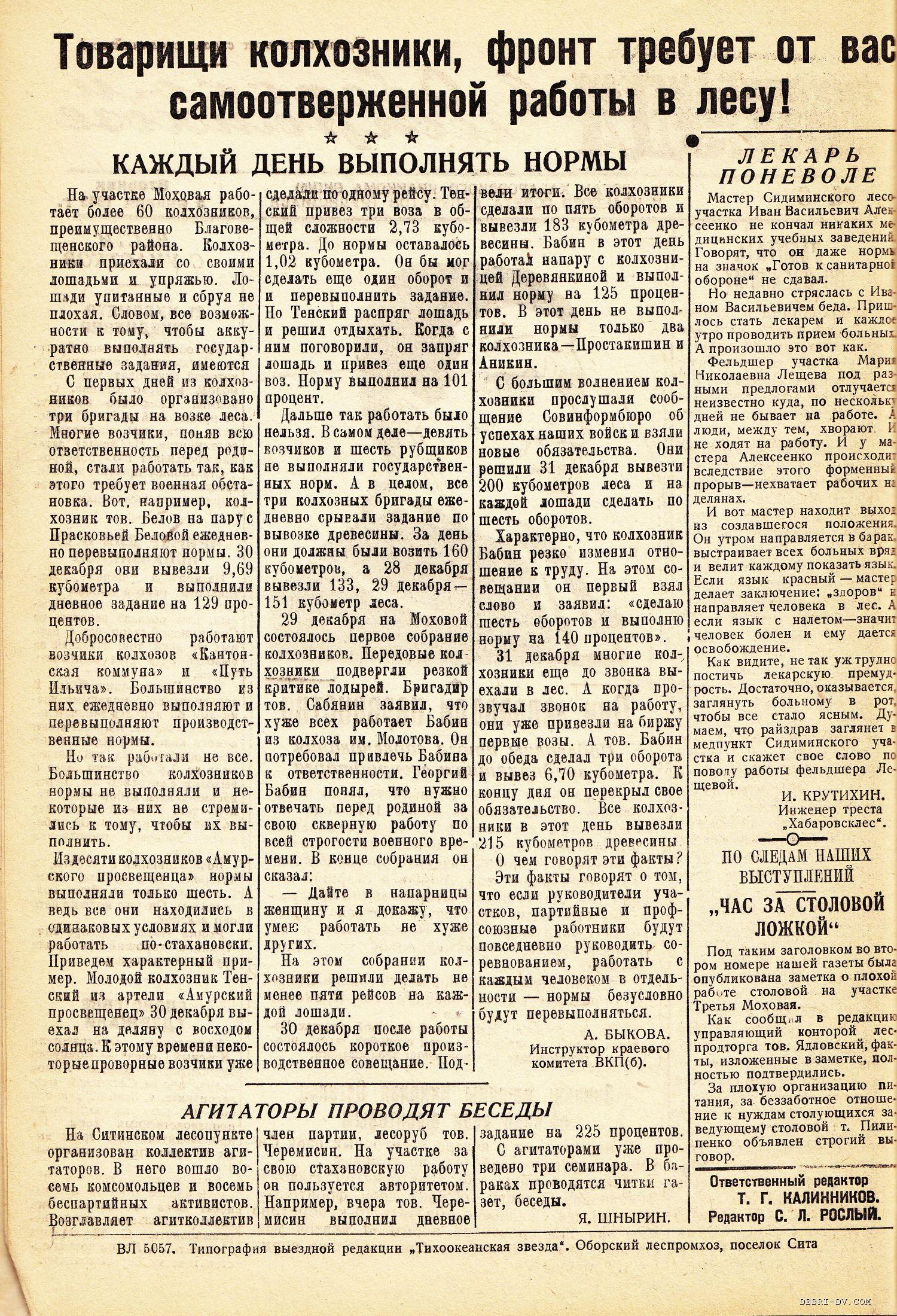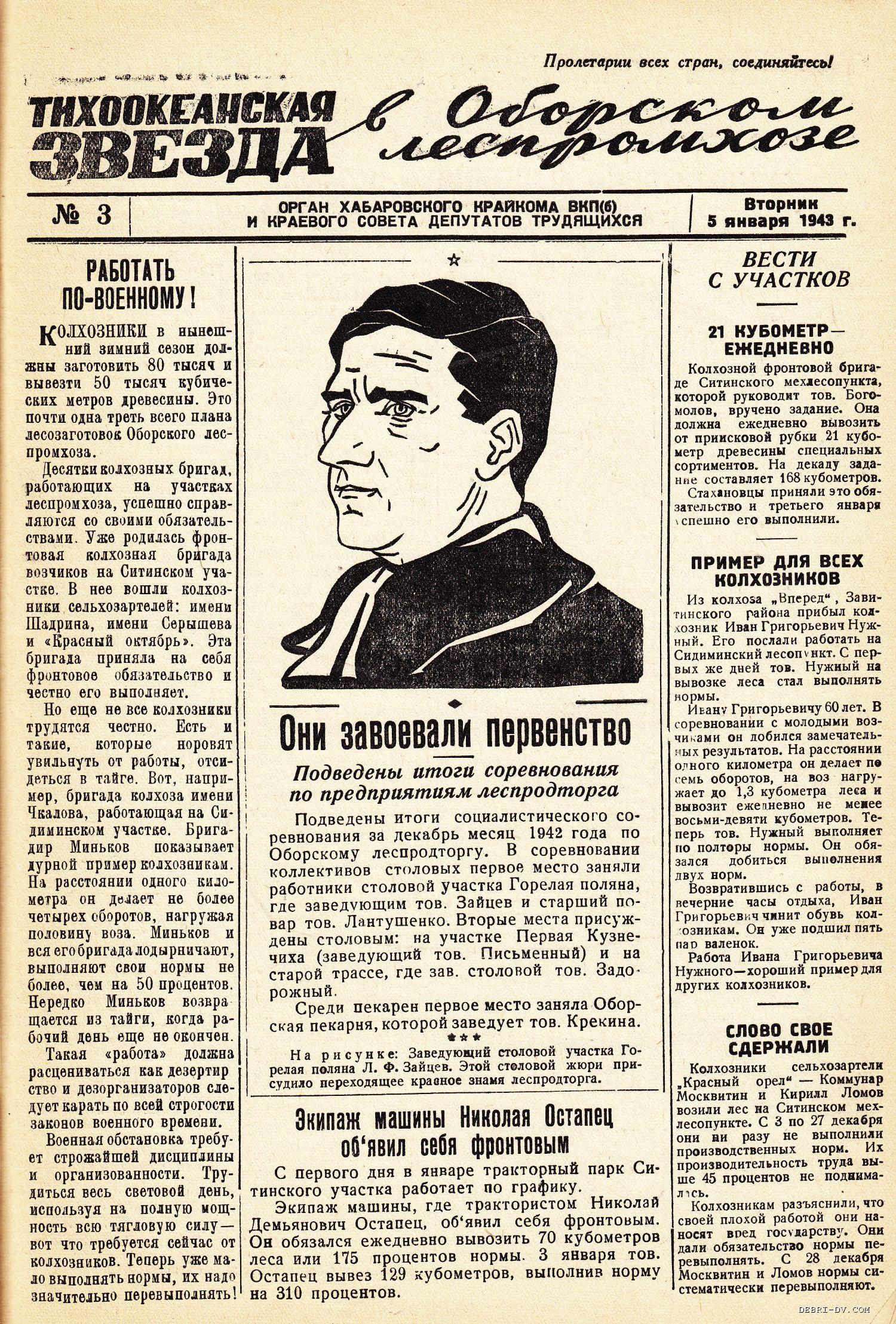| «Тихоокеанская звезда» в Оборском леспромхозе, №3, 05.01.1943 г./ Нажмите, чтобы УВЕЛИЧИТЬ стр.1 |