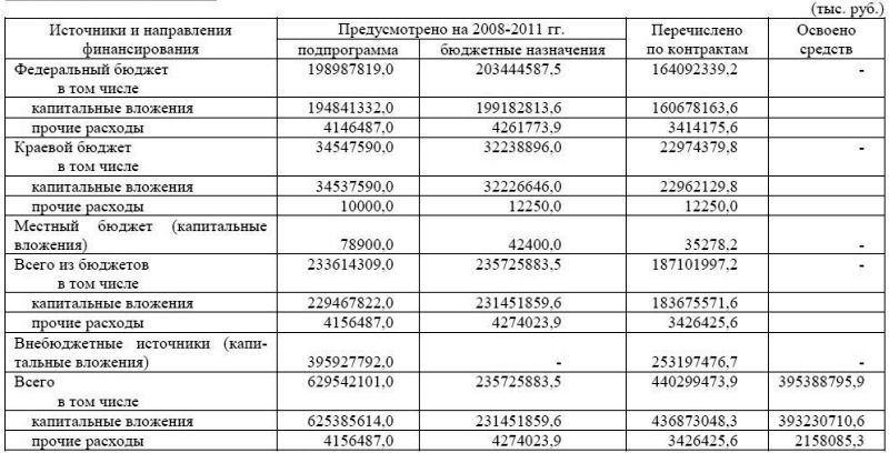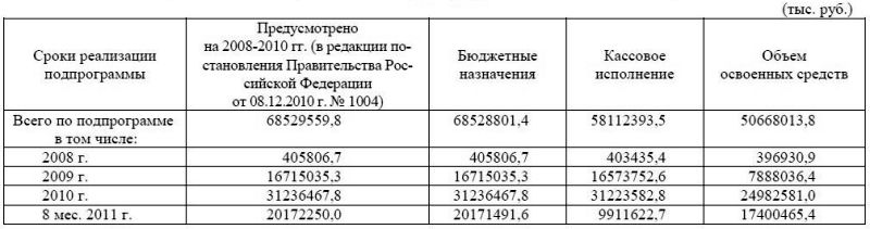 По оперативным данным Минрегиона России, на 1 октября 2011 года параметры подпрограммы характеризуются следующими показателями: объем перечисленных средств по контрактам составил 474474219,8 тыс. рублей, из них 196772678,7 тыс. рублей за счет бюджетных средств, или 83,4 % бюджетных назначений (236034577,5 тыс. рублей); объем освоенных средств 434875154,8 тыс. рублей, или 91,7 % перечисленных по контрактам средств и 69,1 % программных назначений.