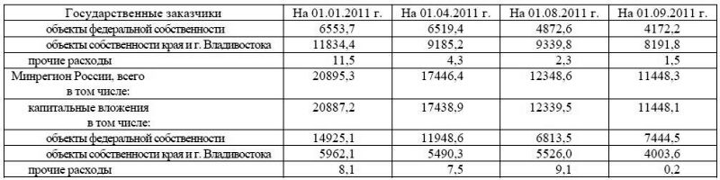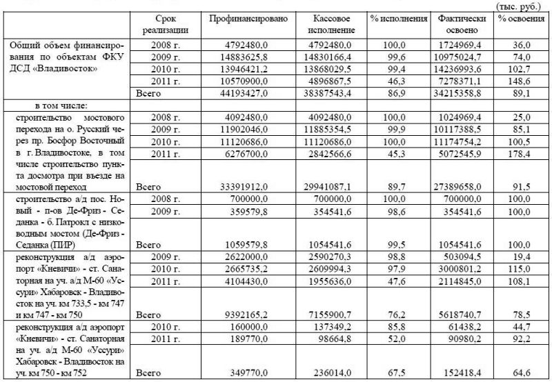 по строительству объектов ДВФУ техническая готовность составила в целом 74,0 %, продлен срок строительства объектов: приемка объектов запланирована на 30 декабря 2011 года, ввод в эксплуатацию 28 февраля 2012 года. Техническая готовность внутренних инженерных систем в корпусах гостиниц от 36,0 %, электромонтажные работы в учебном корпусе 65 %, по строительству ФОК низкое выполнение кровли 16,0 %, по автономной системе водоснабжения монтаж наружных сетей площадки опреснения 44,0 %, монтаж оборудования 50,0 %, работы по благоустройству объекта «финансово-экономический корпус» 42,0 %, монтаж сетей канализации с очистными сооружениями 60,0 %, устройство ливневой канализации 40,0 %. В настоящее время осуществляется корректировка проекта по рекультивации несанкционированной территории свалки и комплекса по переработке и утилизации твердых бытовых отходов. Неосвоенный объем средств по всем объектам ДВФУ (дебиторская задолженность заказчика) составил 6644630,9 тыс. рублей, из них по строительству естественнонаучного учебного корпуса, гостиниц, ФОК, улично-дорожной сети согласно контракту от 18 мая 2009 года № ГП09/05146 3527430,0 тыс. рублей; по строительству финансово-экономического корпуса и общеуниверситетского центра согласно контракту от 23 июня 2010 года № ГП10/0628 1818822,8 тыс. рублей; по магистральным инженерным сетям и сооружениям согласно контракту от 17 декабря 2010 года № ГП10/1251 1100345,1 тыс. рублей. По состоянию на 1 января 2011 года объем неосвоенных средств (дебиторская задолженность) составлял 6142206,1 тыс. рублей, на 1 января 2010 года 6864931,9 тыс. рублей.