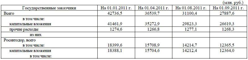 Таким образом, реализация подпрограммы осуществляется в условиях опережающих темпов обеспечения финансовыми ресурсами над их освоением в целях снятия рисков выполнения работ в установленные сроки. Однако при высоких темпах финансирования сохраняется тенденция образования дебиторской задолженности государственных заказчиков (объем неосвоенных средств подрядными организациями), которая по состоянию на 1 сентября 2011 года составила более 10 % перечисленных по контрактам средств. На эту же дату по ряду объектов наблюдалось отставание от графиков строительства, которое составляло от 1 до 7 месяцев. По оперативным данным, на 1 ноября 2011 года отставание от графиков составило до 2 месяцев.