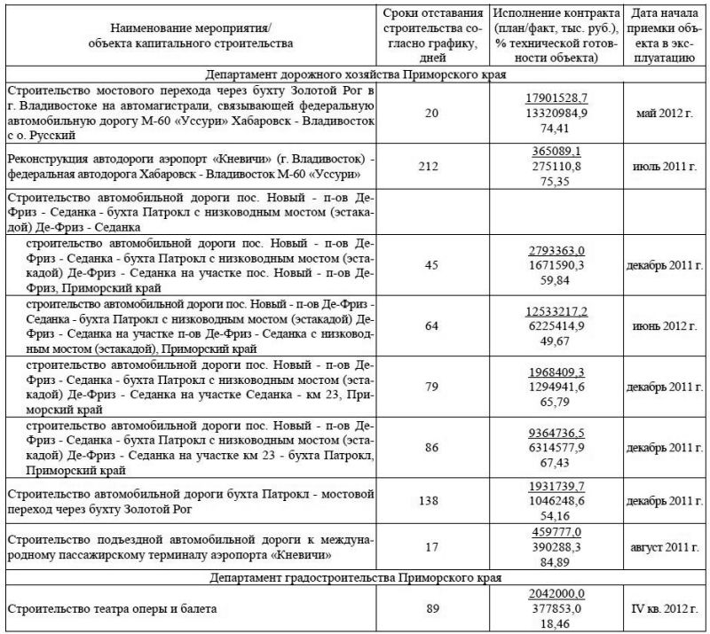 Департаментом дорожного хозяйства Приморского края не обеспечен своевременный ввод в эксплуатацию 2 объектов, в том числе реконструкция автодороги аэропорт «Кневичи» (г. Владивосток) федеральная автодорога Хабаровск Владивосток М-60 «Уссури» и строительство подъездной автомобильной дороги к международному пассажирскому терминалу аэропорта «Кневичи», сроки ввода соответственно, июль и август 2011 года.