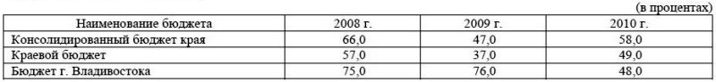 Обеспеченность собственными доходами на душу населения за счет консолидированного бюджета в 2010 году составила 49,0 тыс. рублей, или 102,1% по сравнению с уровнем 2009 года; краевого бюджета 40,0 тыс. рублей, или 97,6 %, бюджета г. Владивостока 22,0 тыс. рублей, или 183,3 %, соответственно.