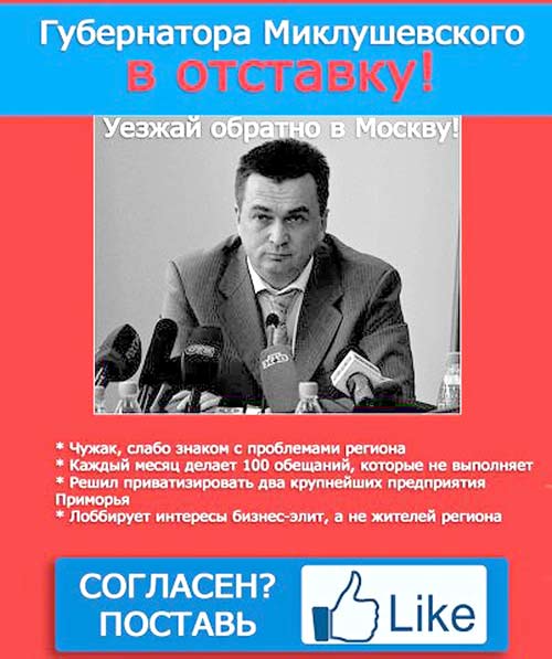 На «Фесйбуке» в разделе «Политика во Владивостоке» появился пост, в котором отправляют губернатора в отставку. «Уезжай обратно в Москву!» – и под лозунгом несколько обоснований, почему: «Чужак, слабо знаком с проблемами региона; каждый месяц делает 100 обещаний, которые не выполняет. Решил приватизировать два крупнейших предприятия Приморья; лоббирует интересы бизнес-элит, а не жителей региона».
