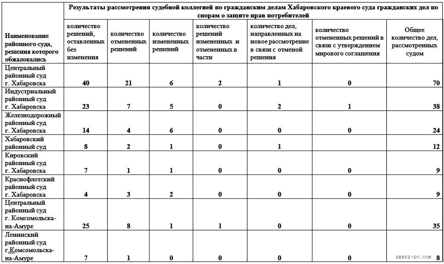 Таким образом, более половины обжалованных решений районных (городских) судов Хабаровского края по данной категории дел оставлены без изменения судебной коллегией по гражданским делам Хабаровского краевого суда.