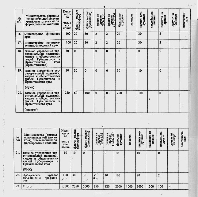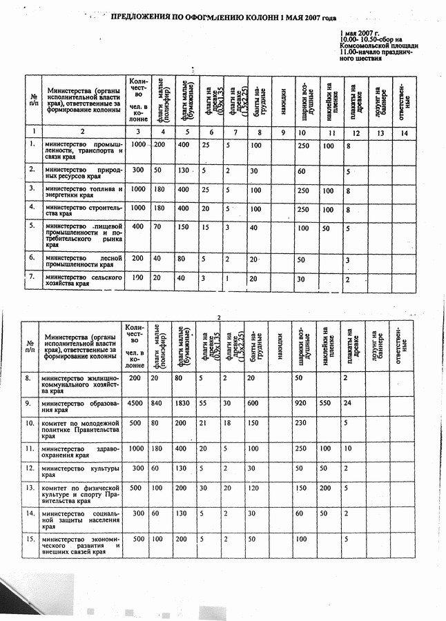 От каждого министерства назначены ответственные за сбор и построение отраслевых колонны, получение и раздачу праздничной атрибутики, своевременное движение. Праздничная атрибутика (банты, флаги, плакаты, воздушные шары, транспаранты и т.д.) будут выдаваться с 9-30 часов в здании Крайсовпрофа в фойе 1-го и минус 2-го этажей.