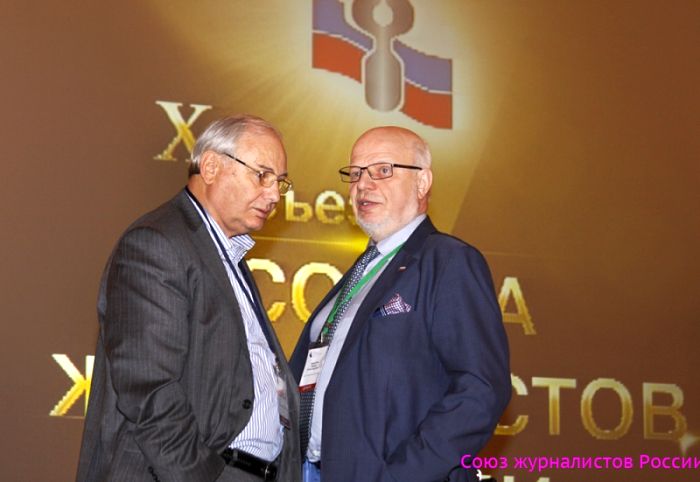 | Депутат Госдумы РФ от Хабаровского края и секретарь СЖР (направление: социальный и правовой статус журналиста) Борис Резник и советник президента РФ, руководитель Совета при президенте РФ по правам человека и секретарь СЖР (направление: законодательство о СМИ, Большое Жюри СЖР, вопросы профессиональной этики и саморегулирования, контакты с федеральными органами государственной власти и Общественной палатой РФ) Михаил Федотов (слева направо) |