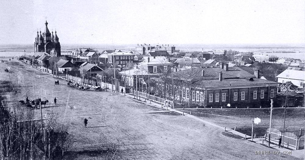...Те, кто живет в нем давно или родился здесь, утверждают, что теперь он совсем не похож на тот, каким был еще недавно. Был же он и маленьким и плохоньким... - пишет Нагишкин. - Среди толпы приземистых домов, недружелюбно поглядывавших друг на друга через грязные улицы, одиноко возвышались самые приметные здания - универсальный магазин фирмы «Кунст и Альберс», кафедральный собор на лысой площади, губернаторский дом с огромным садом, который по праздникам на два часа открывался для гулянья горожан и откуда виден был величественный памятник Муравьеву-Амурскому со свитком бумаги в одной руке и другой рукой, положенной на шпагу.