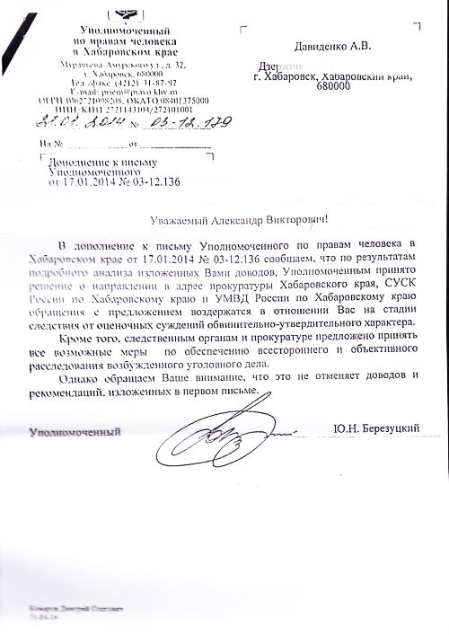 Давиденко заявляет, что «в связи с предъявленным СУ СКР по Хабаровскому краю обвинением по возбужденному этим же органов уголовного дело, я, Давиденко А.В., не согласен, совершение каких-либо преступных деяний, в том числе в составе группы лиц, отрицаю».
