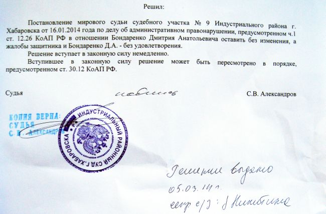 Вчера, Индустриальный районный суд Хабаровска в апелляционной инстанции оставил в силе постановление мирового судьи судебного участка №9. Решение, как записано в документе «вступает в силу немедленно».